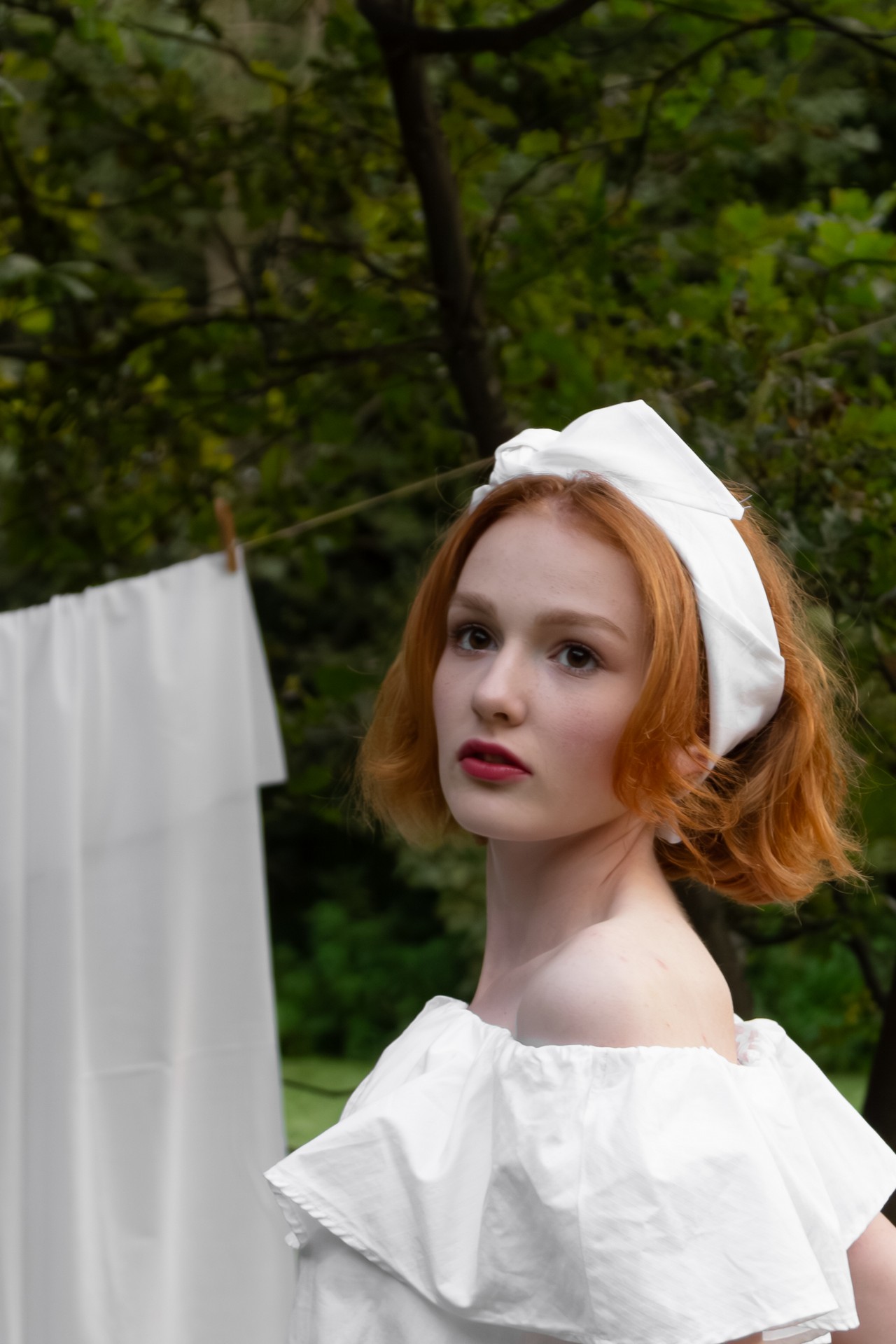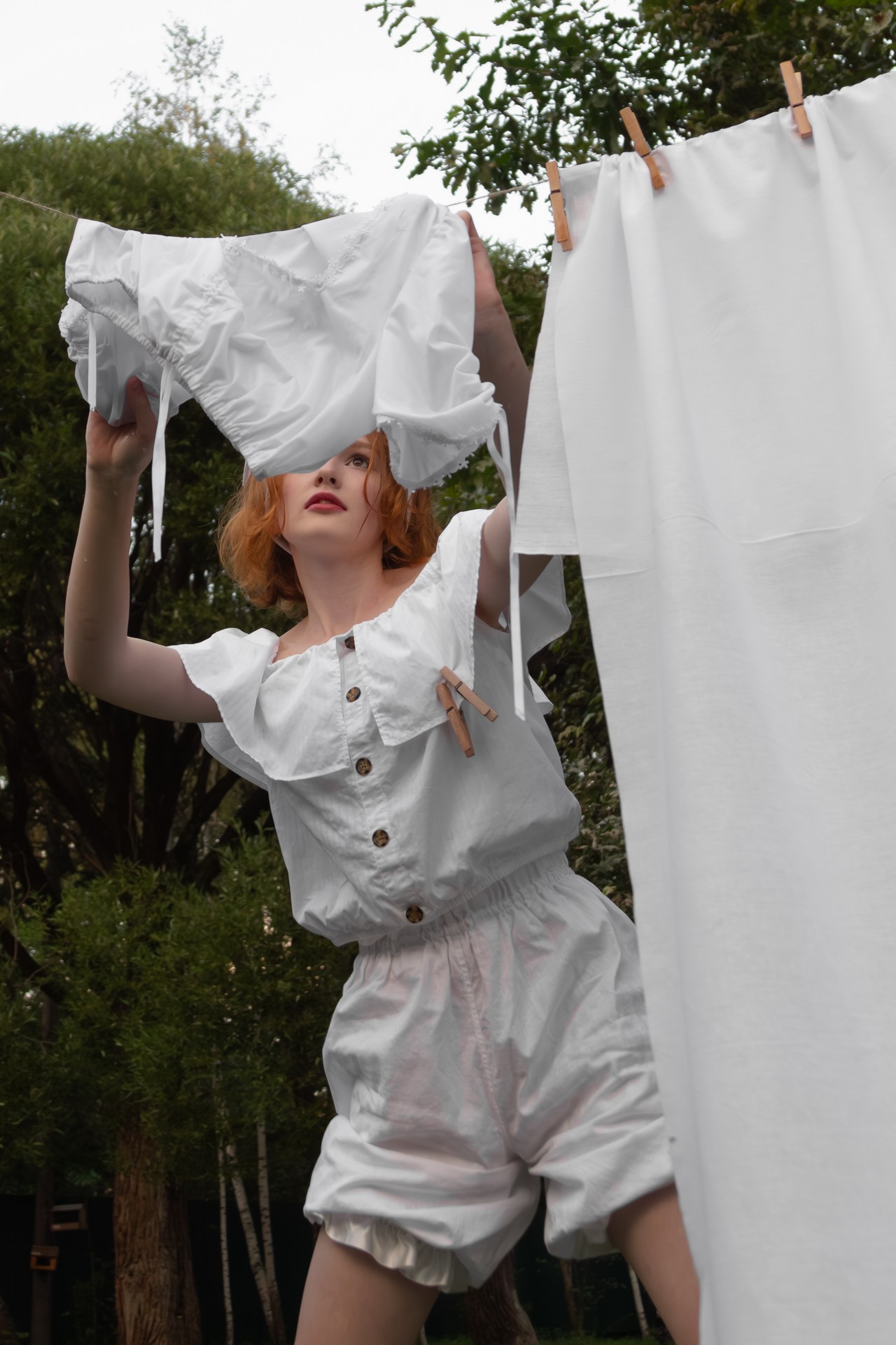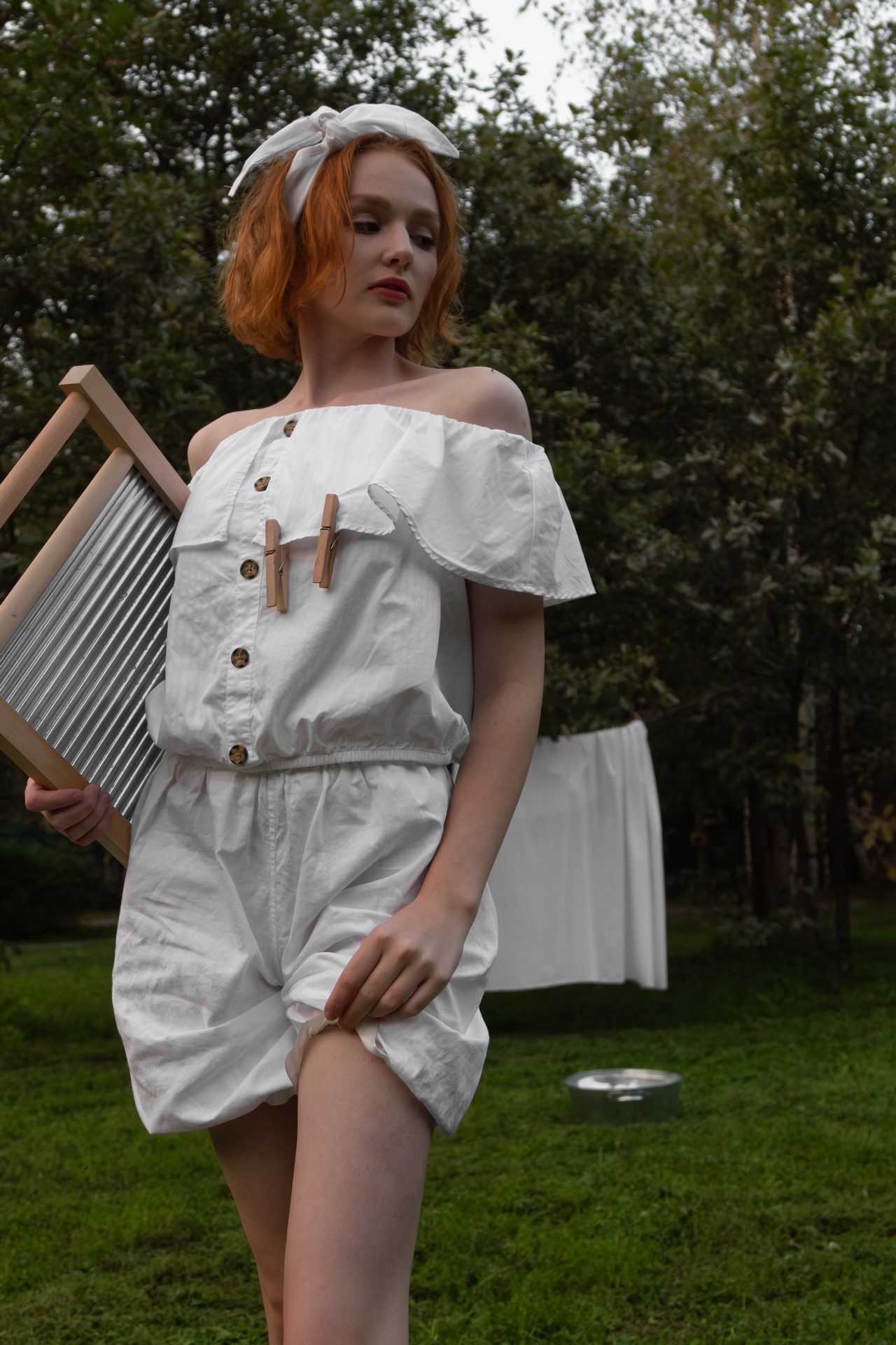 Игра на контрастах в основе съёмки: мягкая женственность и бытовая работа в окружении живописной природы создают яркие и атмосферные кадры. Лёгкий ретро-образ с использованием аутентичных деталей, таких как старинная стиральная доска, деревянные прищепки, тазик и белье, добавит фотосессии шарма и ностальгической романтики.