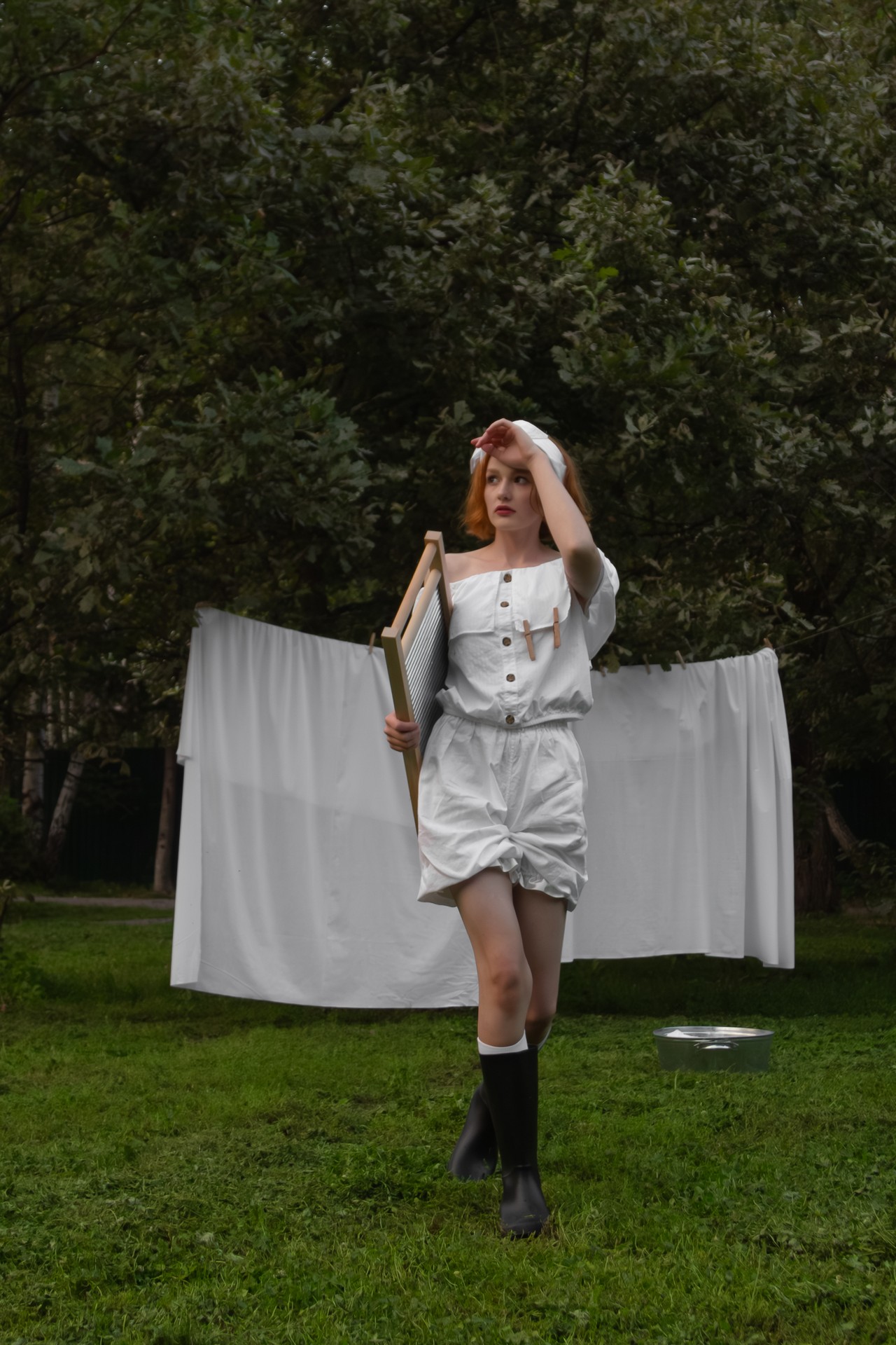 Арт-съёмка «Стирка» — это необычный, креативный фотопроект, который переносит нас в атмосферу прошлого, когда стирка белья вручную была частью повседневной жизни. Вдохновлённая винтажной эстетикой, эта фотосессия создаёт уникальный образ девушки, стирающей бельё в тазу на стиральной доске, но на фоне современного парка.