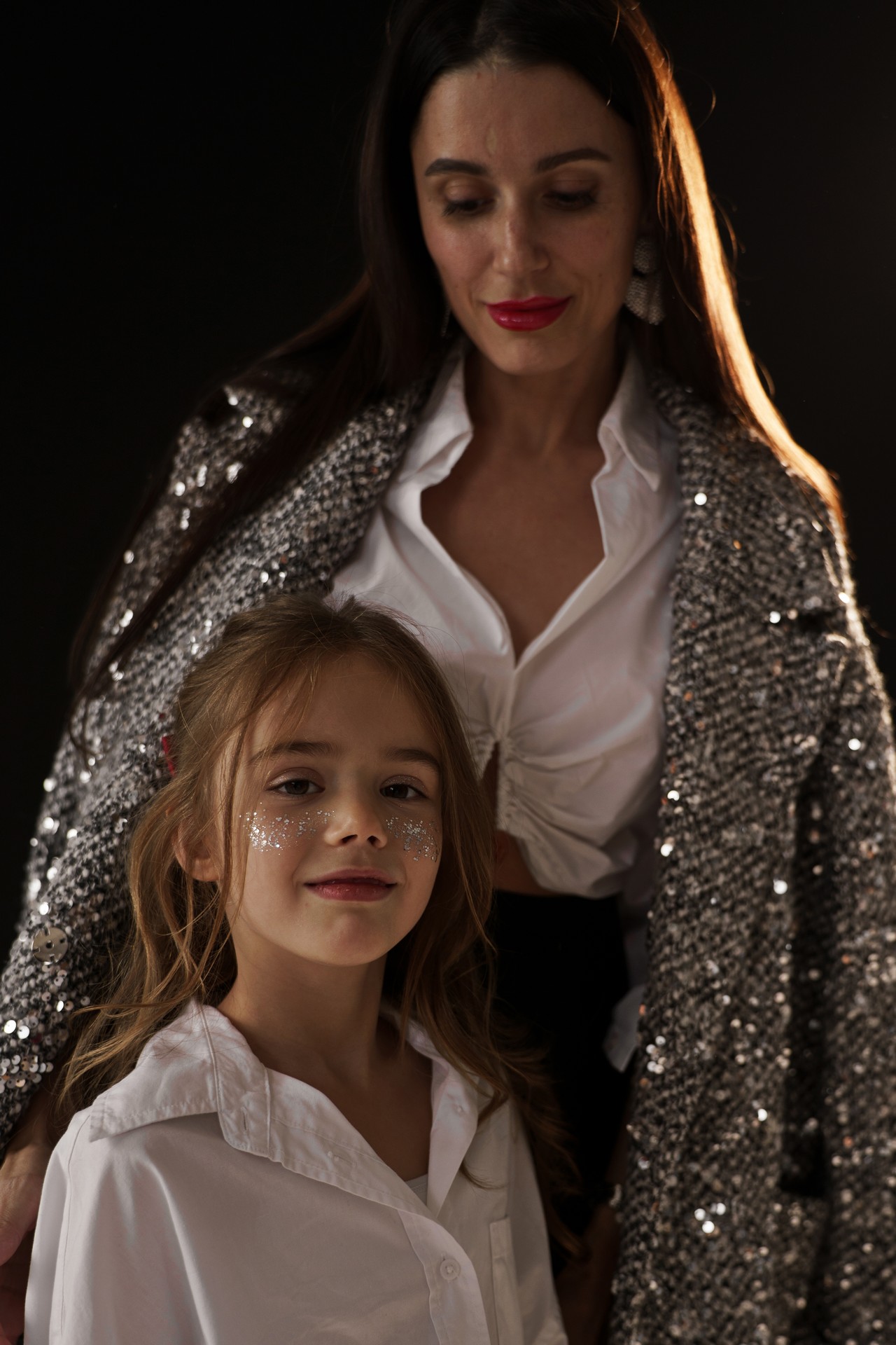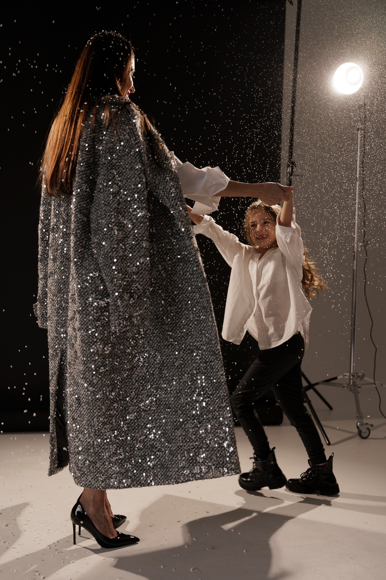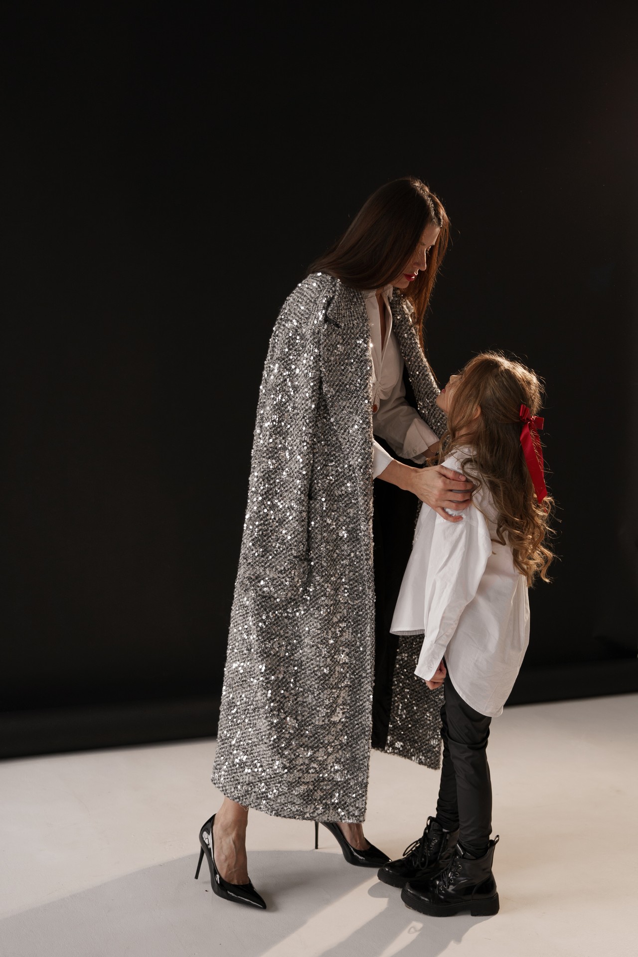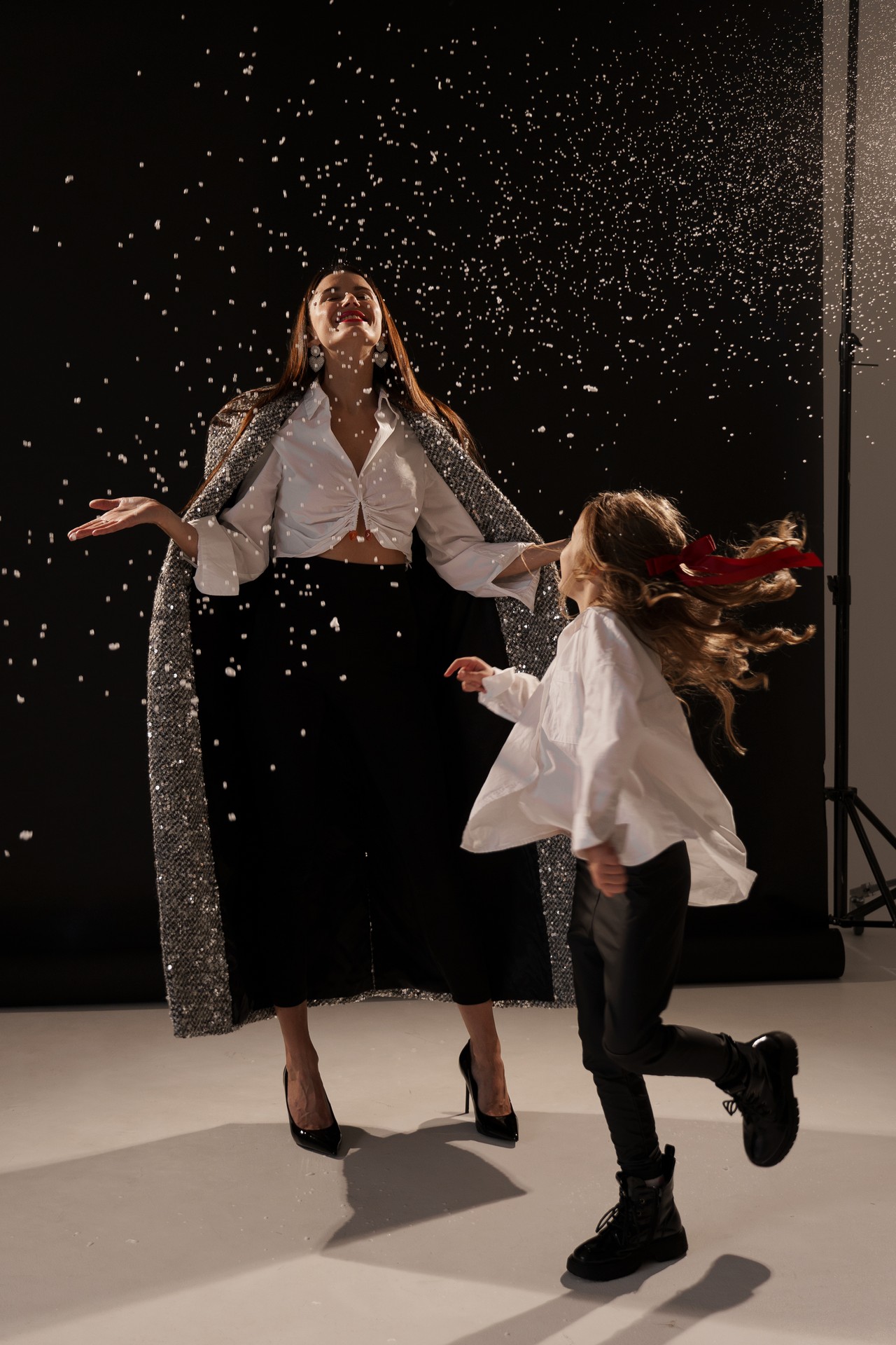 Новогодняя фотосессия мамы и дочки — это момент, наполненный волшебством, когда за кадром остаётся всё лишнее, и остаётся только чистая радость, блеск в глазах и ощущение тепла рядом с самым дорогим человеком. На фоне глубокого черного полотна, под легким пушистым искусственным снегом создаётся настоящая сказка!